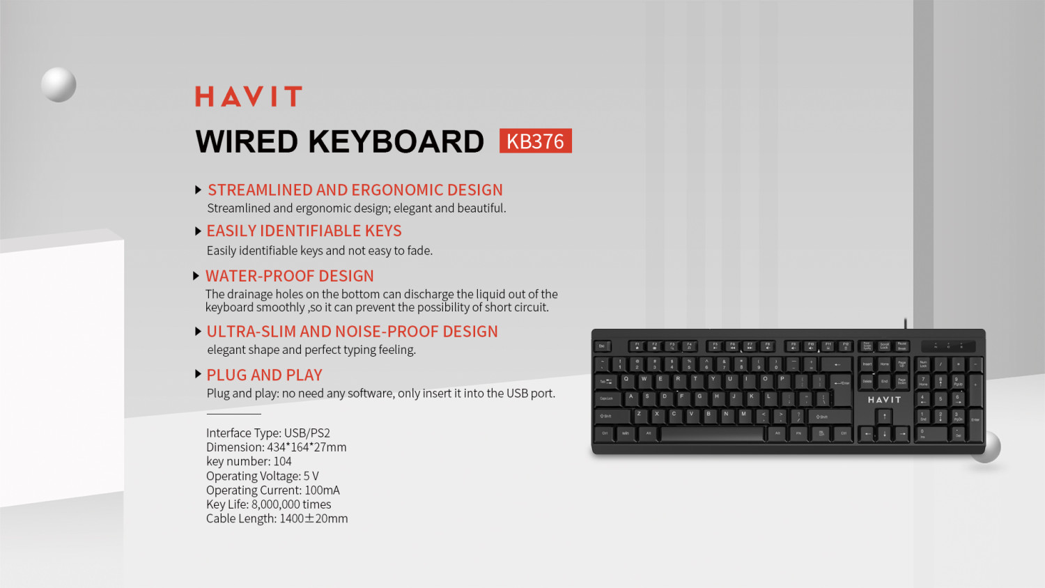 TECLADO USB HAVIT*104 TECLAS*CABLE 1.5mt*TECLADO EN ESPAÑOL