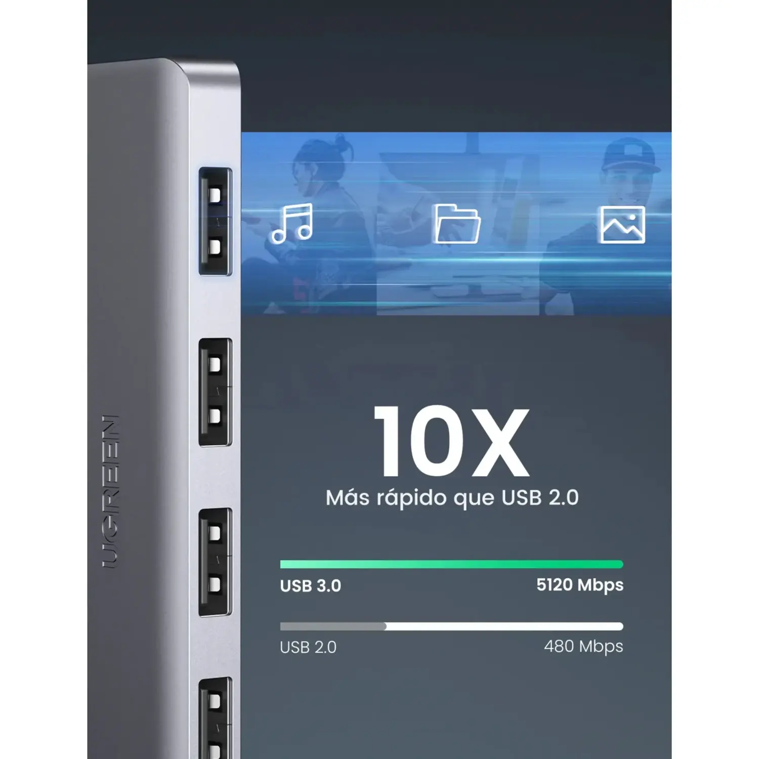 datos superrápida de hasta 5 Gbps, 10 veces más rápida que la del USB